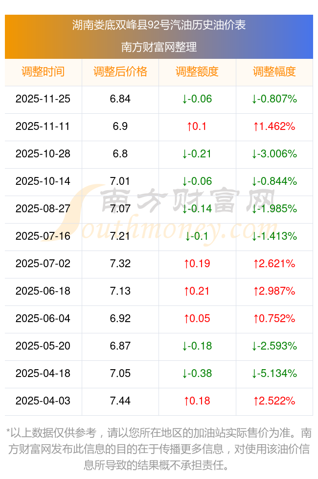 湖南婁底雙峰縣12月2日92號汽油歷史油價調整一覽表