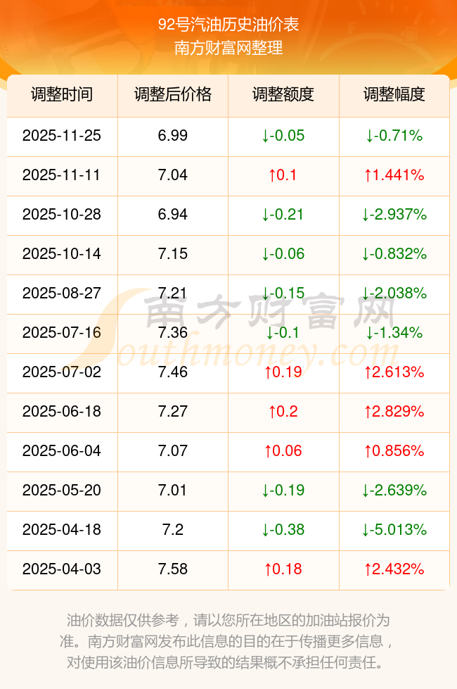 12月2日汽油、柴油每升的價格是11月25日調整后的價格:92號汽油為6.99元,下調了0.05元,下調幅達0.71%;95號汽油為7.47元,下調了0.06元,下調幅達0.8%;89號汽油為6.48元,下調了0.06元,下調幅達0.92%;0號柴油為6.59元,下調了0.05元,下調幅達0.75%。下一輪油價調整時間12月8日24時,距離現(xiàn)在還有6.14天。