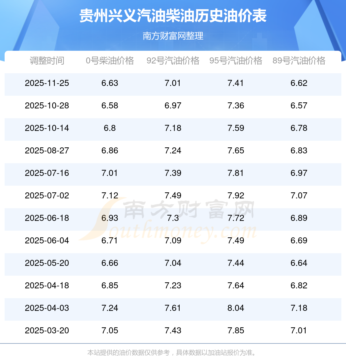 貴州興義汽油柴油12月2日每升的價格為11月25日調(diào)整后的價格,各油價詳情如下:92號汽油7.01元;95號汽油7.41元;89號汽油6.62元;0號柴油6.63元。下一輪油價調(diào)整時間12月8日24時,距離現(xiàn)在還有6.14天。
