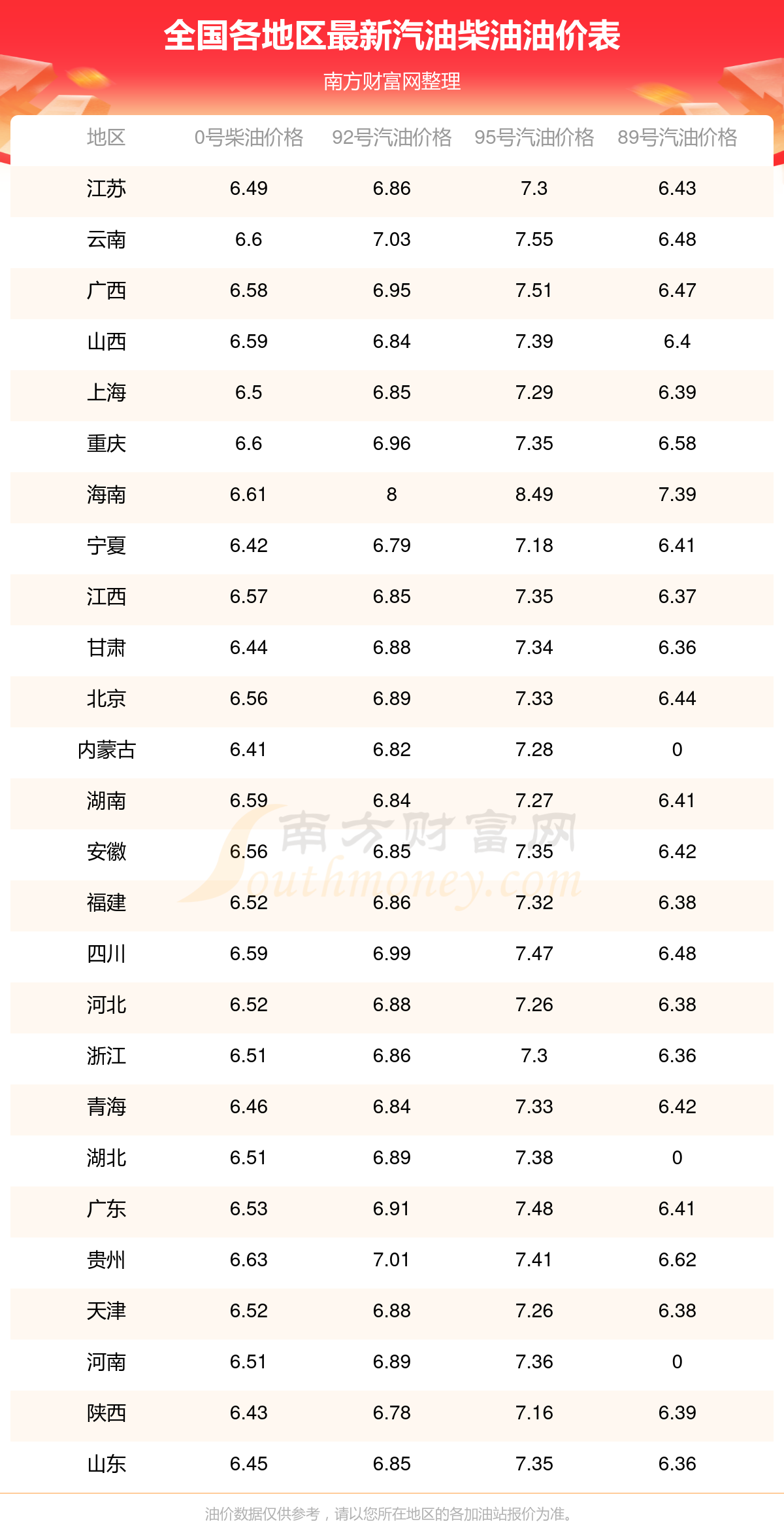 2025年12月2日全國(guó)各地汽油價(jià)格一覽表