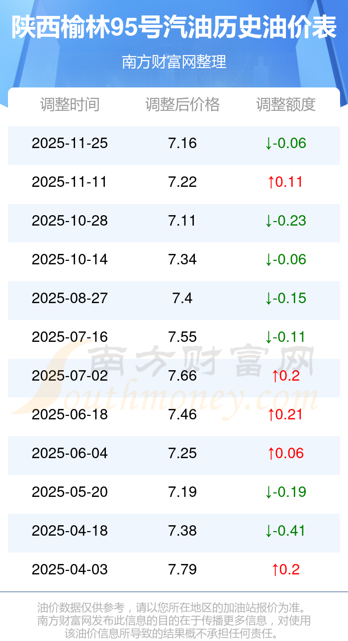 12月2日陜西榆林95號汽油的價格為7.16元每升,本次調(diào)整時間為11月25日,相對上次調(diào)整時間11月11日的油價7.22元每升,下調(diào)了0.06元,下調(diào)幅達(dá)0.831%。下一輪油價調(diào)整時間12月8日24時,距離現(xiàn)在還有6.13天。