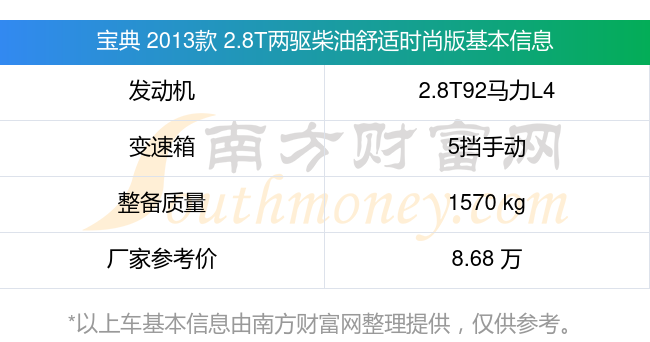 寶典 2013款 2.8T兩驅(qū)柴油舒適時(shí)尚版動(dòng)力上配備的是一臺2.8T92馬力L4渦輪增壓發(fā)動(dòng)機(jī),匹配的是5擋手動(dòng)擋變速箱,燃料形式為柴油,常規(guī)整備質(zhì)量1570kg,廠家參考價(jià)8.68萬元。