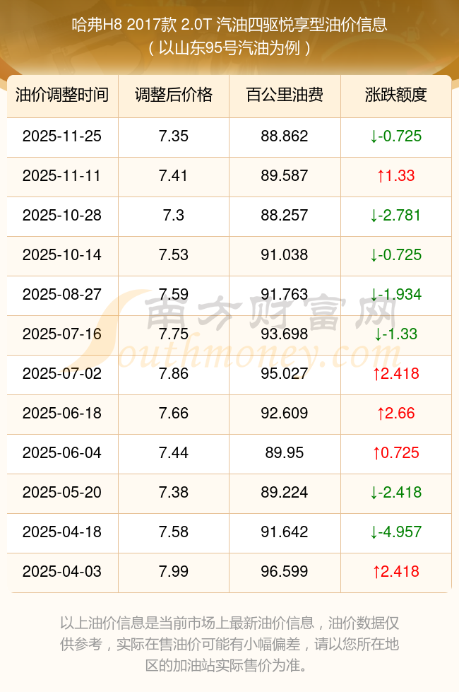 按照11月25日95號(hào)汽油最新調(diào)整價(jià)格7.35元/升來計(jì)算(以山東為例),該車型百公里平均油費(fèi)為88.862元,按照上一輪11月11日調(diào)整價(jià)格7.41元/升來計(jì)算,百公里平均油費(fèi)為89.587元,對(duì)比上一輪少花0.725元,下一輪油價(jià)調(diào)整時(shí)間為12月8日24時(shí)。