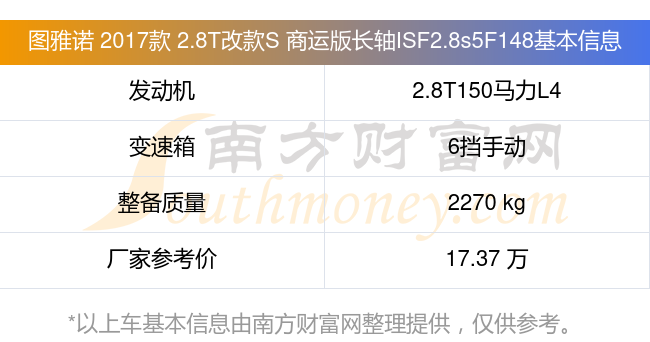 圖雅諾 2017款 2.8T改款S 商運(yùn)版長軸ISF2.8s5F148動力上搭載的是一臺2.8T150馬力L4渦輪增壓發(fā)動機(jī),匹配6擋手動擋變速箱,燃料形式為柴油,常規(guī)整備質(zhì)量2270kg,廠家參考價(jià)17.37萬元。