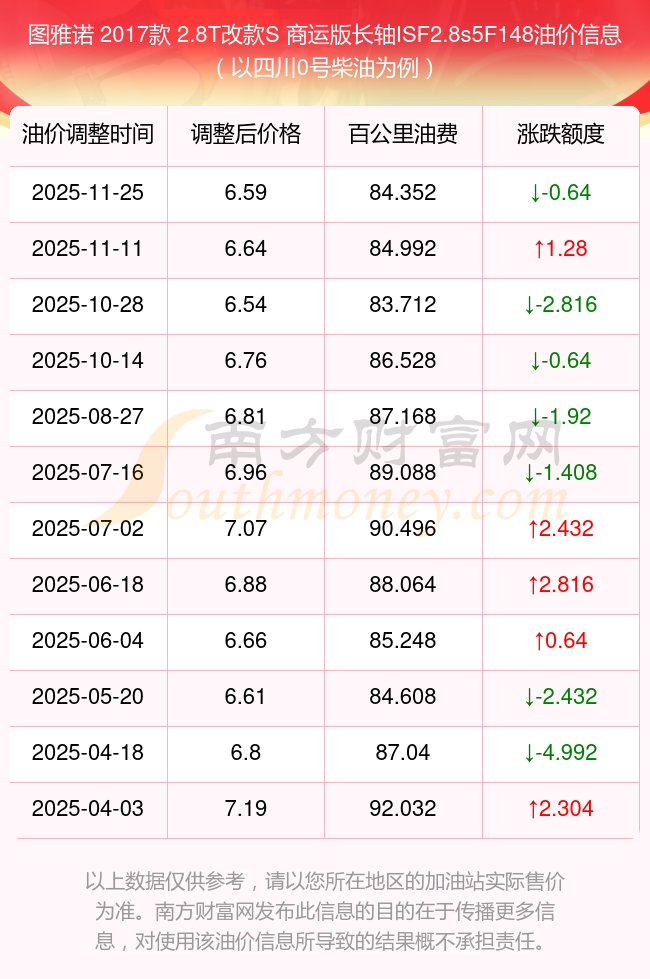 依照11月25日0號柴油最新調(diào)整價(jià)格6.59元/升來計(jì)算(以四川為例),該車型百公里的平均油費(fèi)是84.352元,依照上一輪11月11日調(diào)整價(jià)格6.64元/升來計(jì)算,百公里的平均油費(fèi)是84.992元,對比上一輪少花0.64元,下一輪的油價(jià)調(diào)整時(shí)間12月8日24時(shí)。