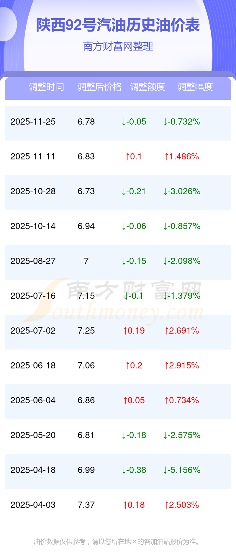 12月2日,陜西92號汽油的價格是6.78元每升,本次的調(diào)整時間為11月25日,對比上次的調(diào)整下降了0.05元,下降0.732%,下次調(diào)整時間為12月8日24時,還有6.11天。