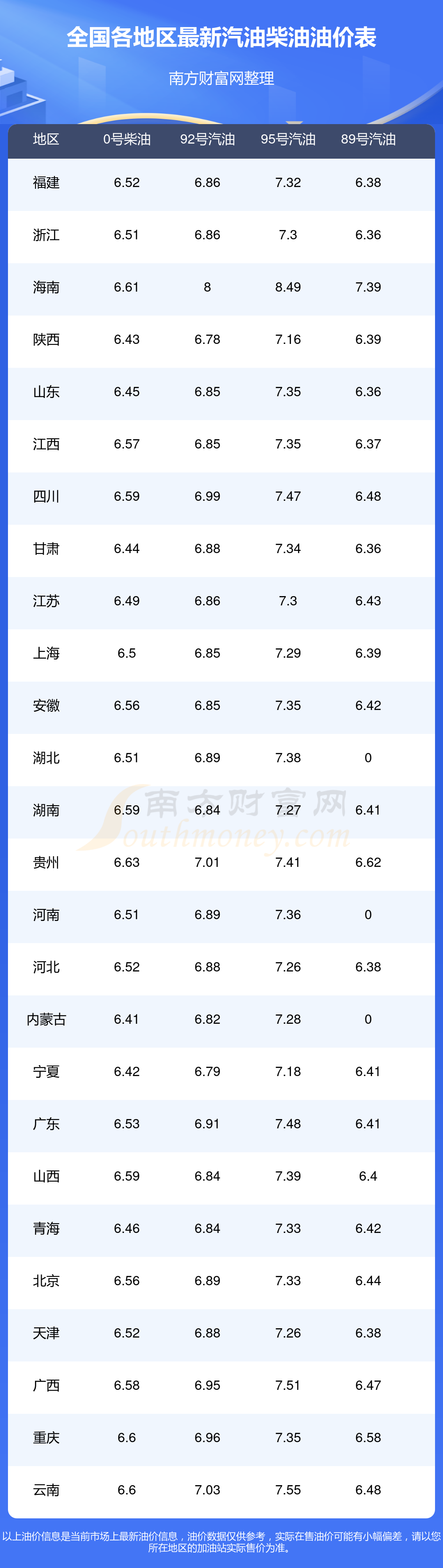 油價調(diào)整最新消息:油價最新調(diào)整時間為11月25日 ,全國92號汽油最新平均價格為:7元每升,其中,最高為海南,價格為8.00元/升,最低為陜西,價格為6.78元/升。全國95號汽油最新平均價格為:7元每升,其中,最高為海南,價格為8.49元/升,最低為陜西,價格為7.16元/升。全國0號柴油最新平均價格為:7元每升,其中,最高為貴州,價格為6.63元/升,最低為內(nèi)蒙古,價格為6.41元/升。全國89號汽油最新平均價格為:6元每升,其中,最高為海南,價格為7.39元/升,最低為浙江,價格為6.36元/升。下一輪汽油價格調(diào)整時間12月8日24時,距離現(xiàn)在還有6.1天。