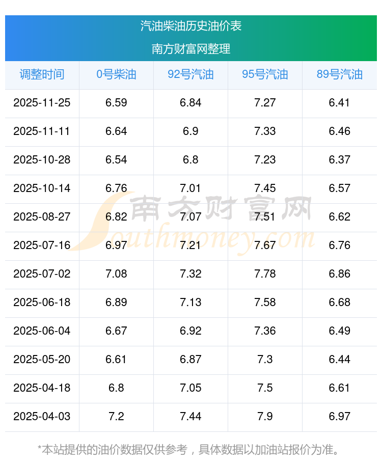12月2日長沙92號汽油的價格為6.84元/升,為11月25日油價調(diào)整后的價格,相對上次調(diào)整下調(diào)了0.06元,下調(diào)0.807%。下一輪油價調(diào)整時間12月8日24時,距離現(xiàn)在還有6.08天。