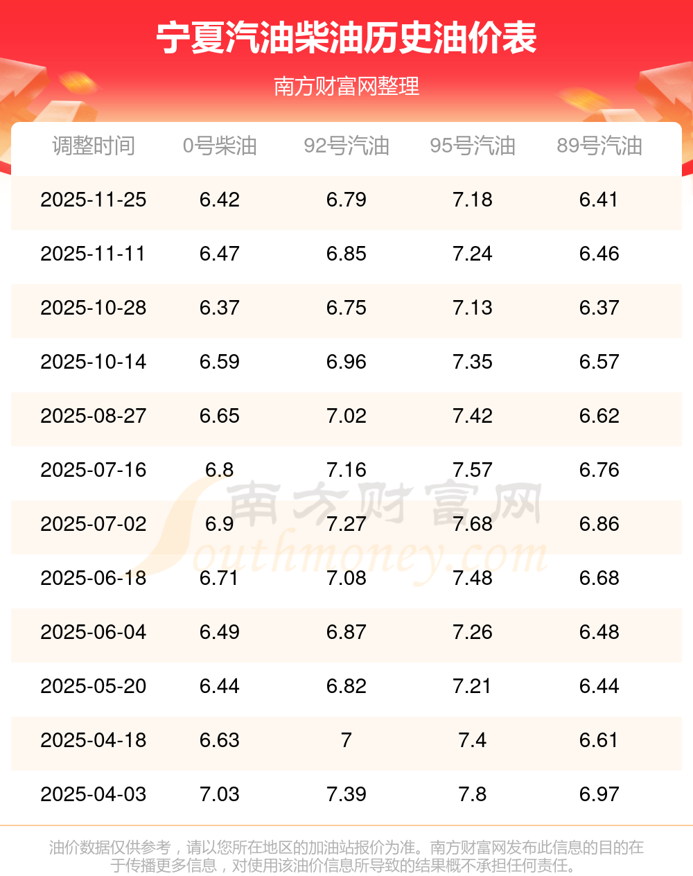 12月3日,寧夏95號汽油的價格是7.18元每升,本次的調(diào)整時間為11月25日,對比上次的調(diào)整降了0.06元,降0.829%,下次調(diào)整時間為12月8日24時,還有5.95天。