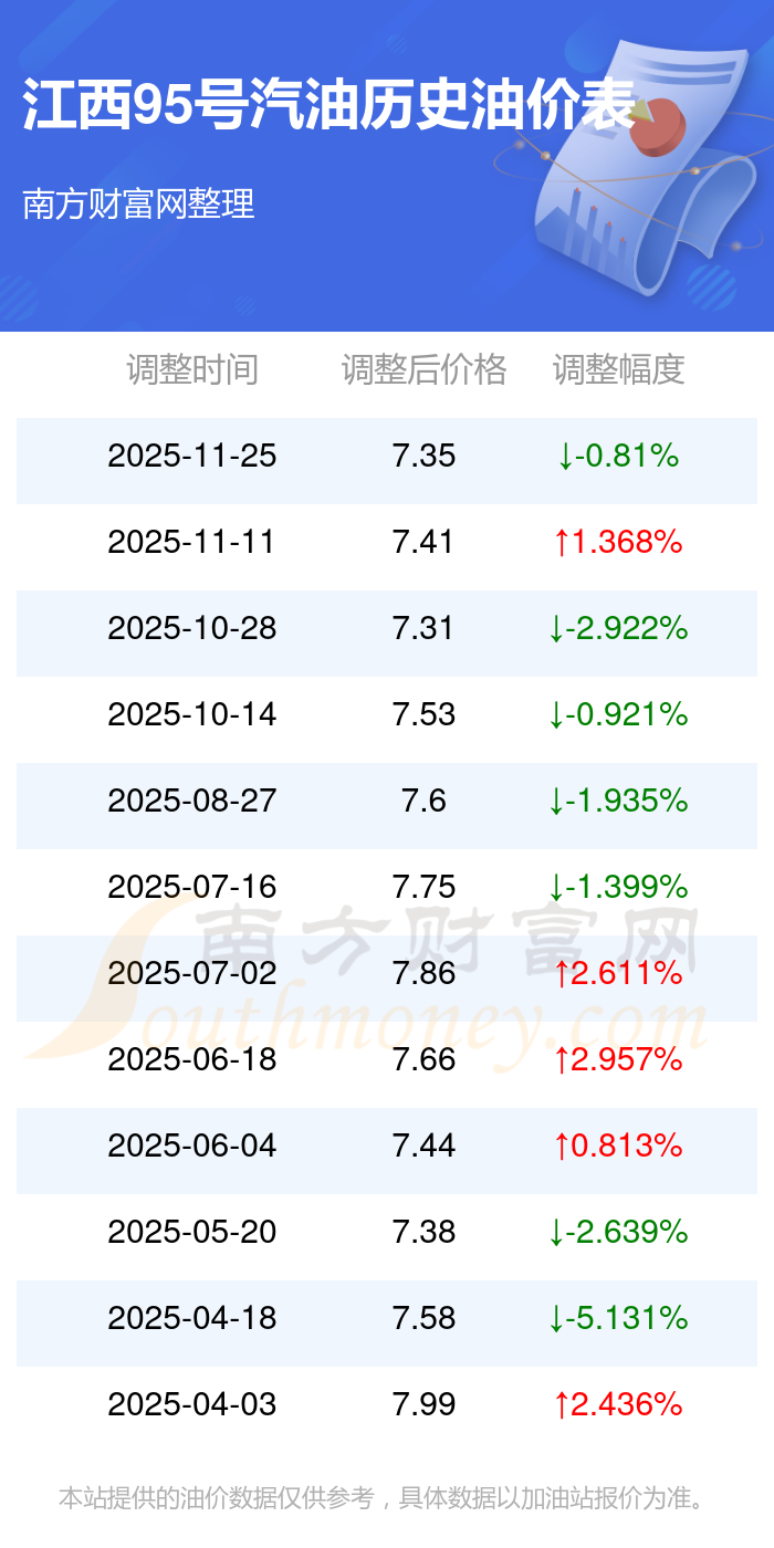 12月3日,江西95號汽油油價是7.35元每升,這是11月25日調(diào)整后的價格,相對上一輪調(diào)整下調(diào)了0.06元,下調(diào)0.81%。
