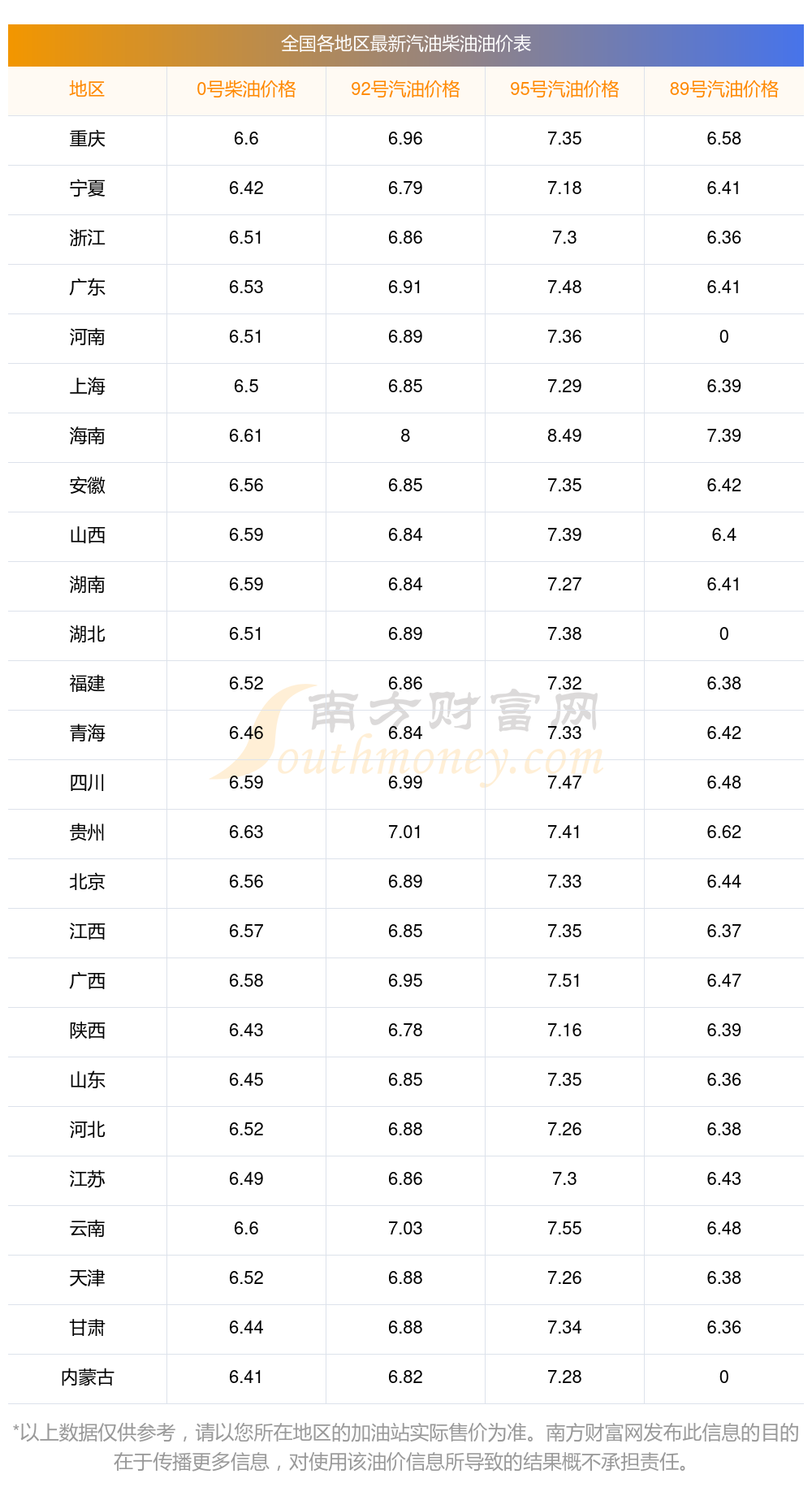 全國89號汽油12月3日的最新價格是11月25日油價調(diào)整后的價格,當(dāng)中,平均價格為6元/升,最低的是浙江,價格6.36元/升,最高的是海南,價格7.39元/升。下一輪油價調(diào)整時間12月8日24時,距離現(xiàn)在還有5.83天。