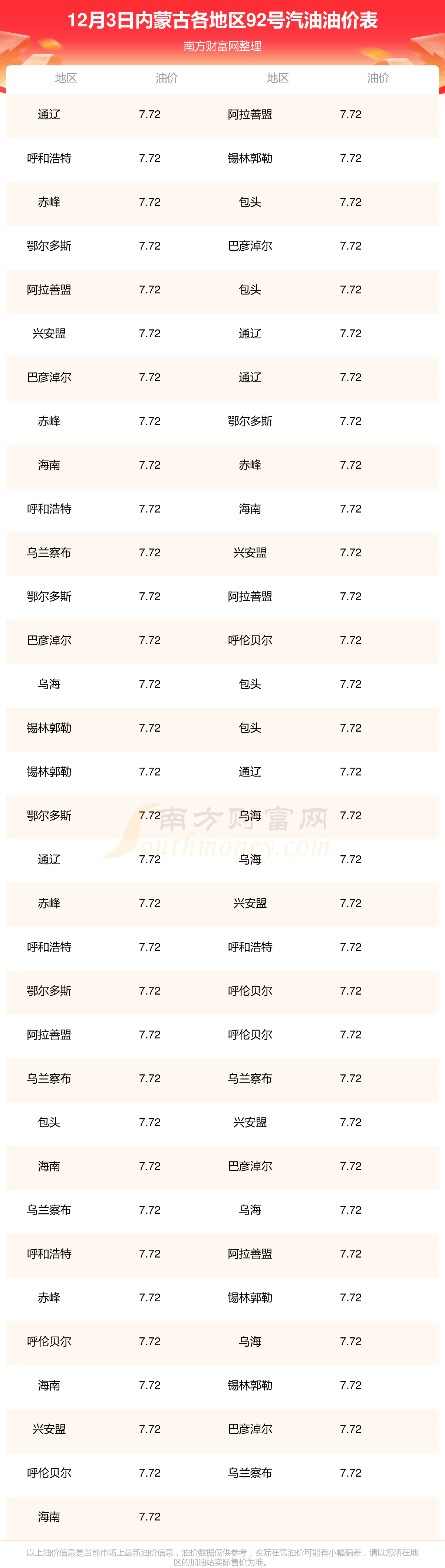 2025年12月3日內(nèi)蒙古92號(hào)汽油最新價(jià)格一覽表