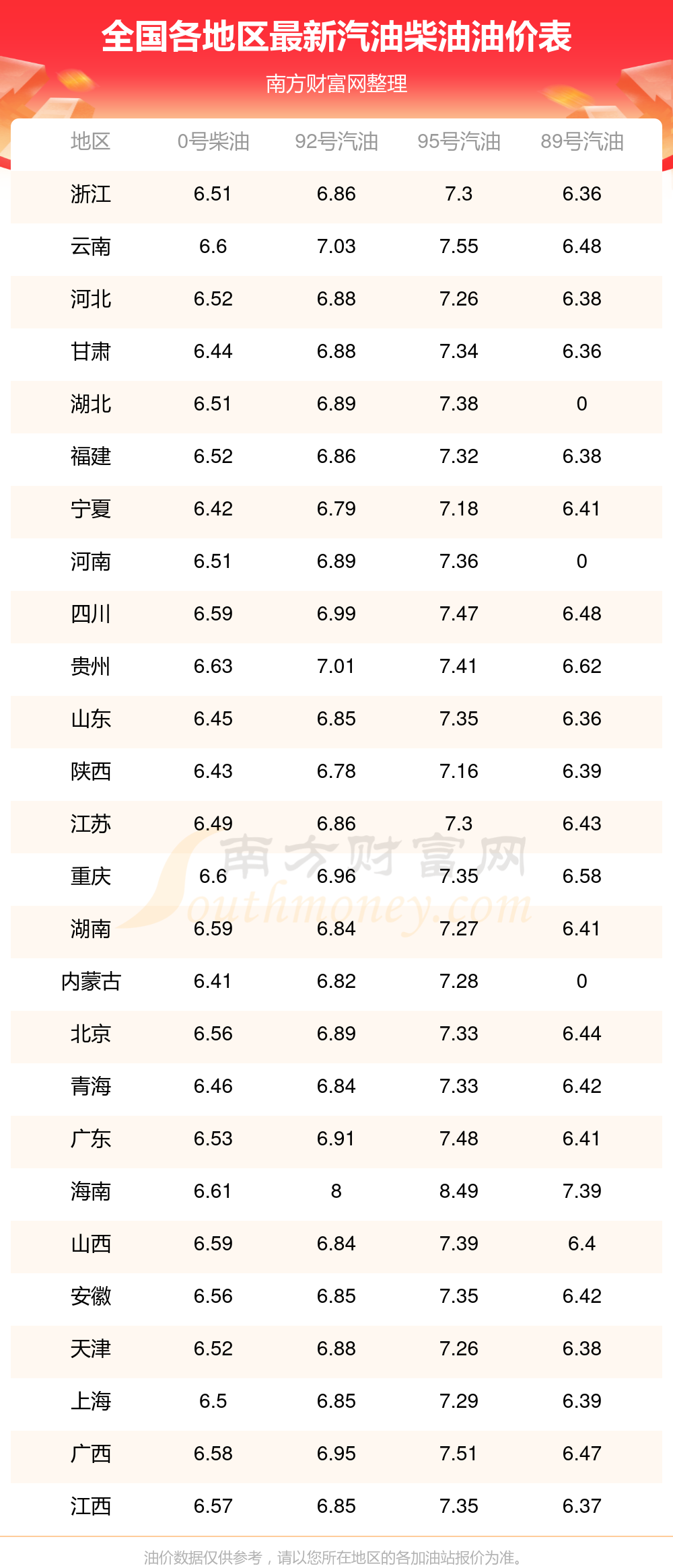 2025年12月3日全國各地汽油價(jià)格表一覽