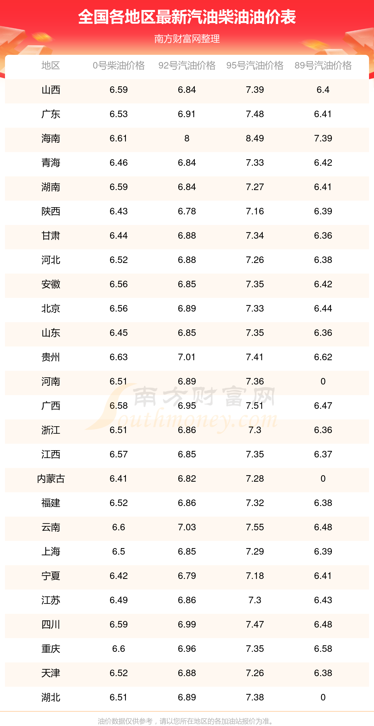 全國(guó)各地區(qū)最新汽油價(jià)格表