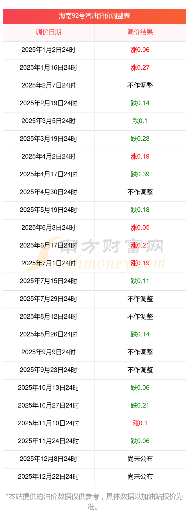 12月3日,海南92號(hào)汽油的價(jià)格是8元每升,本次的調(diào)整時(shí)間為11月25日,對(duì)比上次的調(diào)整降了0.06元,降0.744%,12月8日24時(shí)為下一輪油價(jià)調(diào)整時(shí)間,還有5.75天。