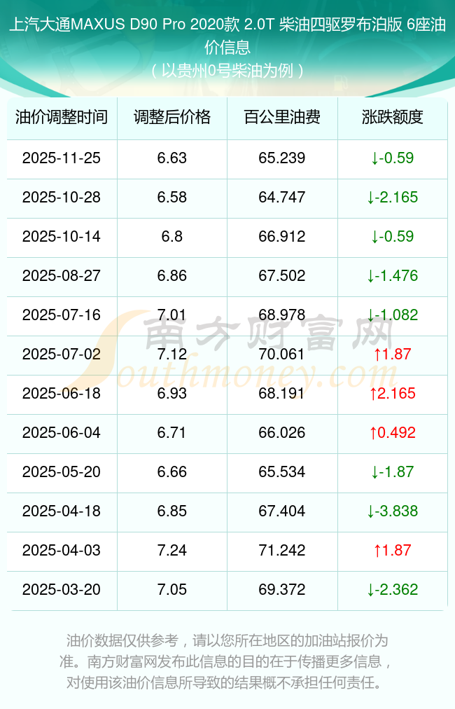 按照11月25日0號(hào)柴油最新調(diào)整價(jià)格6.63元/升來計(jì)算(以貴州為例),該車型百公里平均油費(fèi)為65.239元,按照上一輪10月28日調(diào)整價(jià)格6.69元/升來計(jì)算,百公里平均油費(fèi)為65.83元,對(duì)比上一輪少花0.59元,下一輪油價(jià)調(diào)整時(shí)間為12月8日24時(shí)。