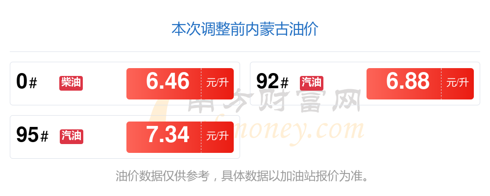 12月3日內(nèi)蒙古汽油、柴油的價(jià)格多少錢一升?本輪油價(jià)調(diào)整時(shí)間是11月25日,92號(hào)汽油6.82元,降了0.06元,降幅達(dá)0.87%;95號(hào)汽油7.28元,降了0.06元,降幅達(dá)0.82%;0號(hào)柴油6.41元,降了0.05元,降幅達(dá)0.77%。