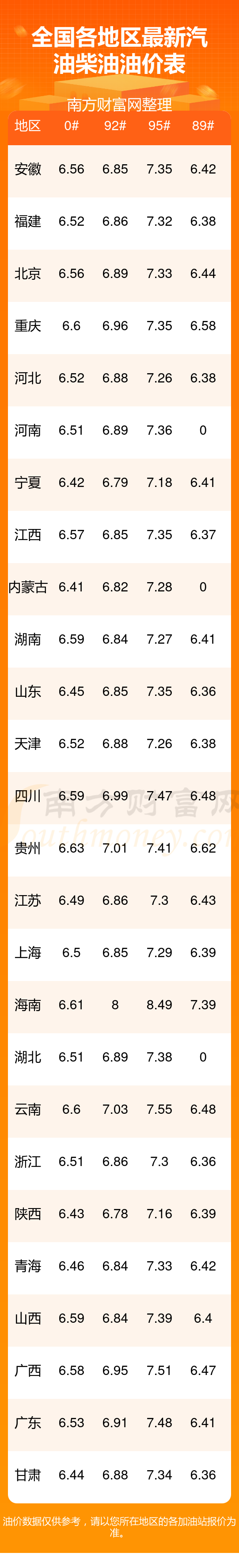 全國95號汽油最新平均價格為:7元每升,其中,最低為陜西,價格為7.16元/升,最高為海南,價格為8.49元/升。
