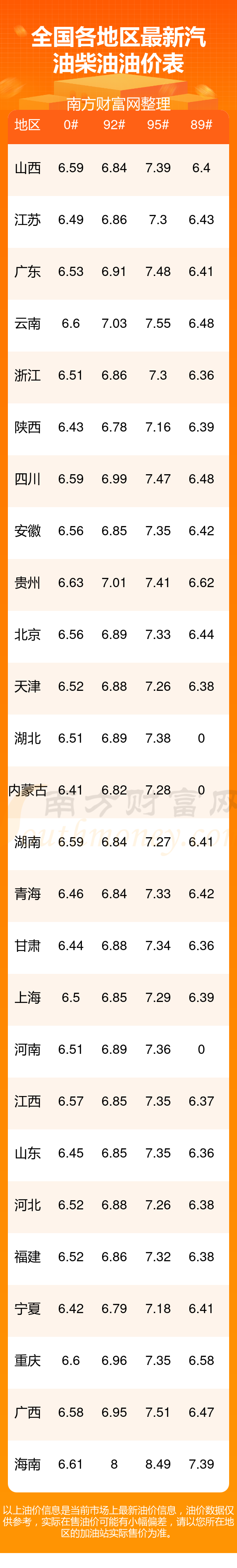 全國各地區(qū)2025年最新油價表