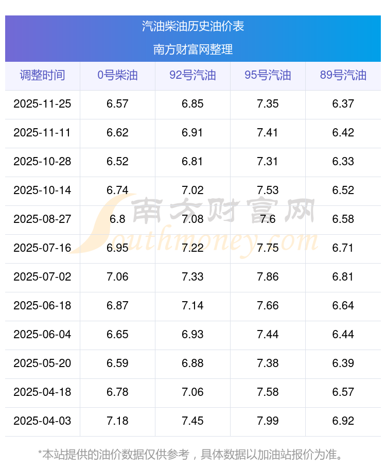 2025年92號(hào)汽油價(jià)格一覽表