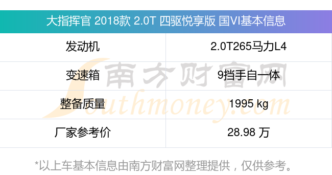 大指揮官 2018款 2.0T 四驅(qū)悅享版 國(guó)VI動(dòng)力方面,搭載的是一臺(tái)2.0T265馬力L4渦輪增壓發(fā)動(dòng)機(jī),匹配9擋手自一體自動(dòng)檔變速箱,燃料形式為汽油,常規(guī)整備質(zhì)量1995kg,廠家參考價(jià)28.98萬元。