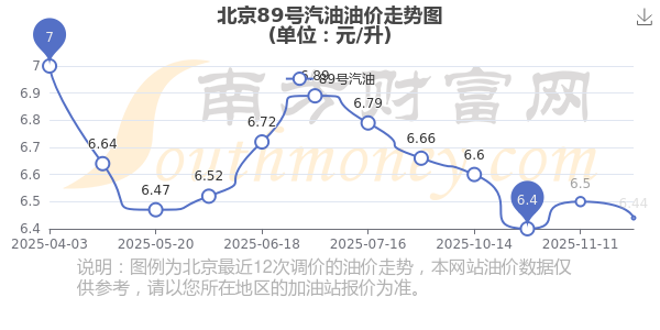 12月3日,北京89號(hào)汽油的最新油價(jià)是6.44元/升,本輪調(diào)整時(shí)間是11月25日,相對(duì)上次油價(jià)調(diào)整共降了0.06元。