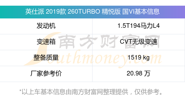 英仕派 2019款 260TURBO 精悅版 國VI動(dòng)力上搭載的是一臺(tái)1.5T194馬力L4渦輪增壓發(fā)動(dòng)機(jī),匹配CVT無級(jí)變速自動(dòng)檔變速箱,燃料形式為汽油,常規(guī)整備質(zhì)量1519kg,廠家參考價(jià)20.98萬元。