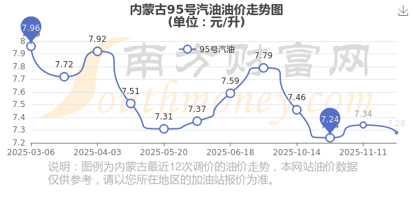 12月3日,內蒙古95號汽油的價格是7.28元每升,本次的調整時間為11月25日,對比上次的調整下調了0.06元,下調0.817%,下次調整時間為12月8日24時,還有5.6天。