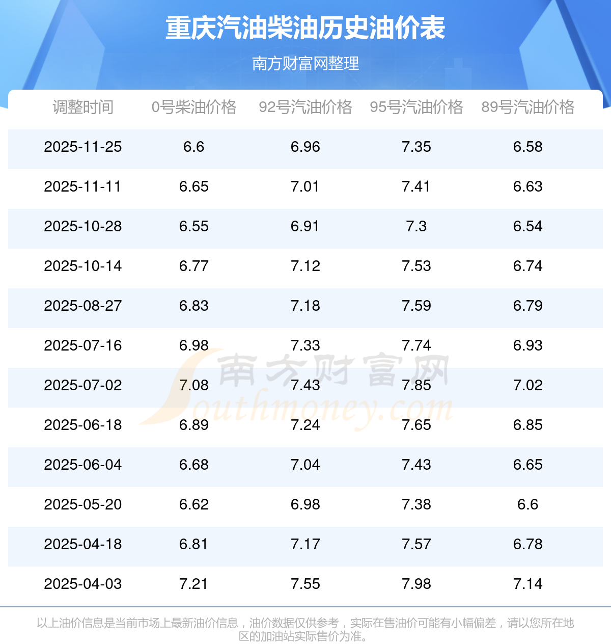 12月3日,重慶92號汽油的最新價格為6.96元/升,油價調(diào)整時間是11月25日,對比上一輪調(diào)整共下跌了0.05元,下跌0.713%。