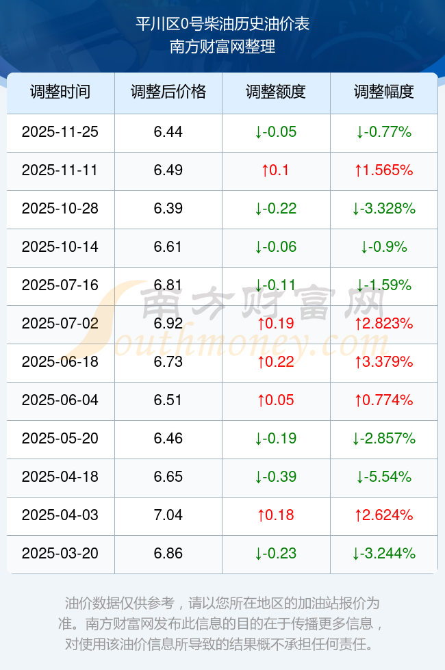 12月3日平川區(qū)0號柴油的最新價格:平川區(qū)0號柴油6.44元/升(根據(jù)11月25日調(diào)整后的價格),相對上次調(diào)整時間11月11日的油價6.49元每升,下降了0.05元,下降0.77%。