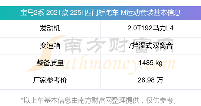 在動力方面,寶馬2系 2021款 225i 四門轎跑車 M運(yùn)動套裝搭載的是一臺2.0T192馬力L4渦輪增壓發(fā)動機(jī),匹配7擋濕式雙離合自動檔變速箱,燃料形式為汽油,常規(guī)整備質(zhì)量1485kg,廠家參考價(jià)26.98萬元。