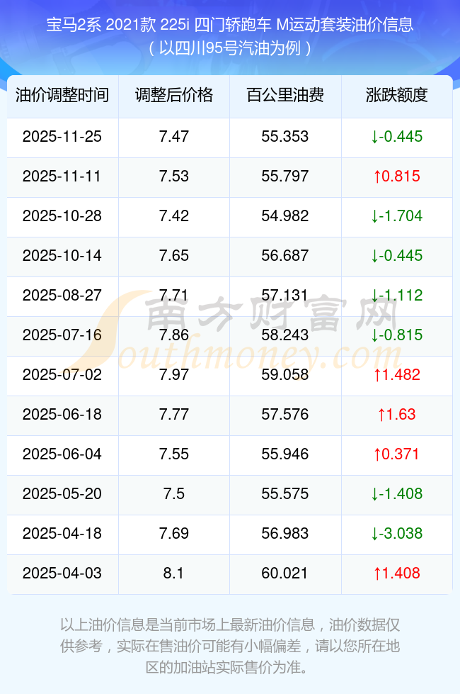 按照11月25日95號汽油最新調(diào)整價(jià)格7.47元/升來計(jì)算(以四川為例),該車型百公里平均油費(fèi)為55.353元,按照上一輪11月11日調(diào)整價(jià)格7.53元/升來計(jì)算,百公里平均油費(fèi)為55.797元,對比上一輪少花0.445元,下一輪油價(jià)調(diào)整時(shí)間為12月8日24時(shí)。