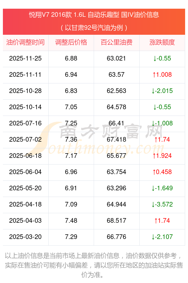 依照11月25日92號汽油最新調整價格6.88元/升來計算(以甘肅為例),該車型百公里的平均油費是63.021元,依照上一輪11月11日調整價格6.94元/升來計算,百公里的平均油費是63.57元,對比上一輪少花0.55元,下一輪的油價調整時間12月8日24時。