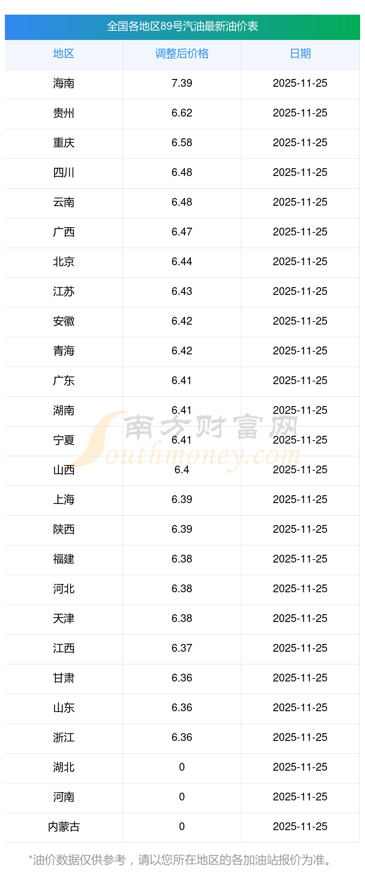 全國(guó)各地區(qū)89號(hào)汽油油價(jià)一覽表