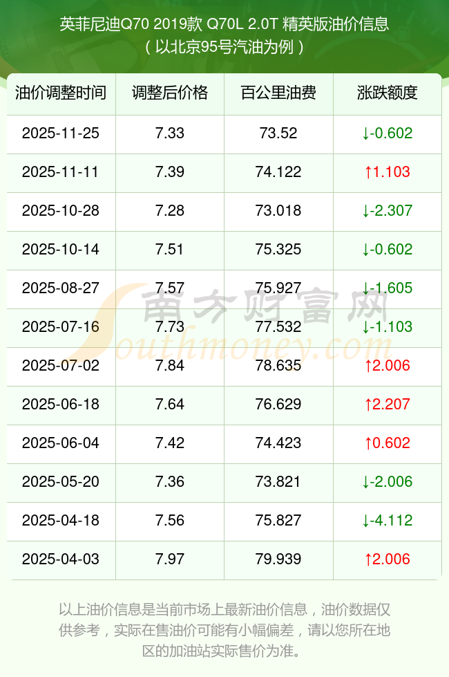 按11月25日95號汽油最新調(diào)整價(jià)格7.33元每升來計(jì)算(以北京為例),該車型百公里平均油費(fèi)為73.52元,按上一輪11月11日調(diào)整價(jià)格7.39元每升來計(jì)算,百公里平均油費(fèi)為74.122元,對比上一輪少花0.602元,下一輪油價(jià)調(diào)整時間為12月8日24時。