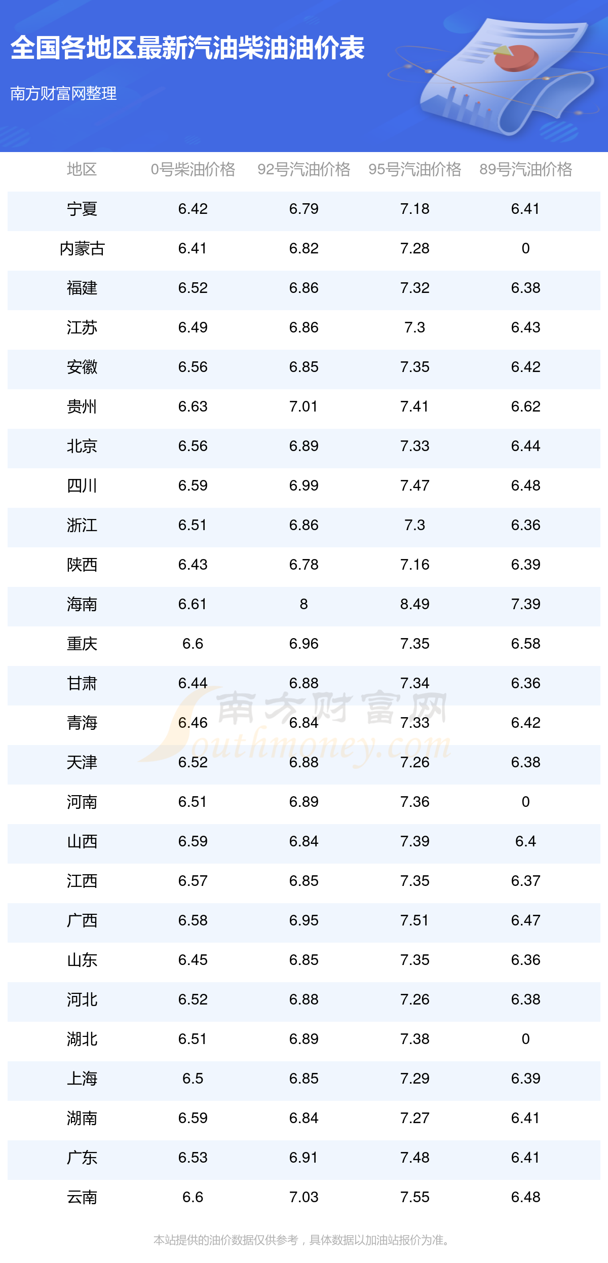 以上數(shù)據(jù)僅供參考,請以您所在地區(qū)的加油站實際售價為準。南方財富網(wǎng)發(fā)布此信息的目的在于傳播更多信息,對使用該油價信息所導致的結(jié)果概不承擔責任。