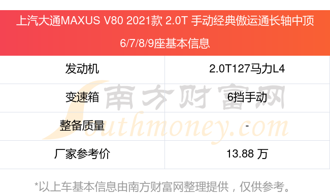 在動力上,上汽大通MAXUS V80 2021款 2.0T 手動經(jīng)典傲運(yùn)通長軸中頂6/7/8/9座配備的是一臺2.0T127馬力L4渦輪增壓發(fā)動機(jī),匹配的是6擋手動擋變速箱,燃料形式為柴油,廠家參考價13.88萬元。