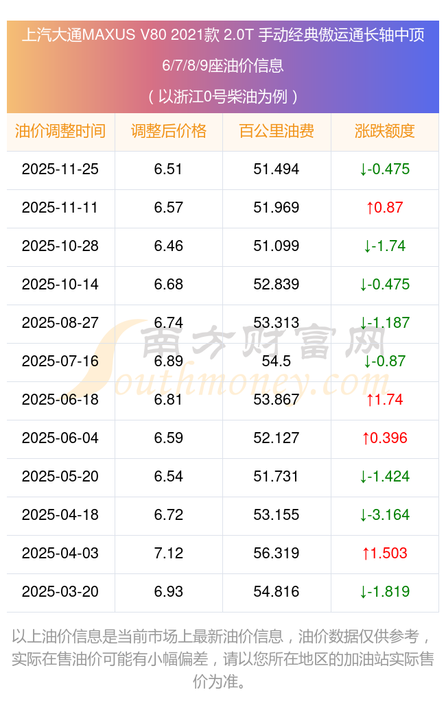 按照11月25日0號柴油最新調(diào)整價格6.51元/升來計算(以浙江為例),該車型百公里平均油費(fèi)為51.494元,按照上一輪11月11日調(diào)整價格6.57元/升來計算,百公里平均油費(fèi)為51.969元,對比上一輪少花0.475元,下一輪油價調(diào)整時間為12月8日24時。
