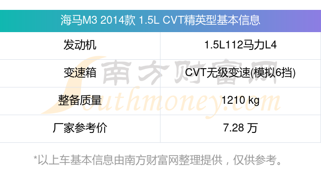 海馬M3 2014款 1.5L CVT精英型搭載了一臺(tái)1.5L112馬力L4自然吸氣發(fā)動(dòng)機(jī),采用CVT無級(jí)變速(模擬6擋)自動(dòng)檔變速箱,常規(guī)整備質(zhì)量1210kg,廠家參考價(jià)7.28萬元。