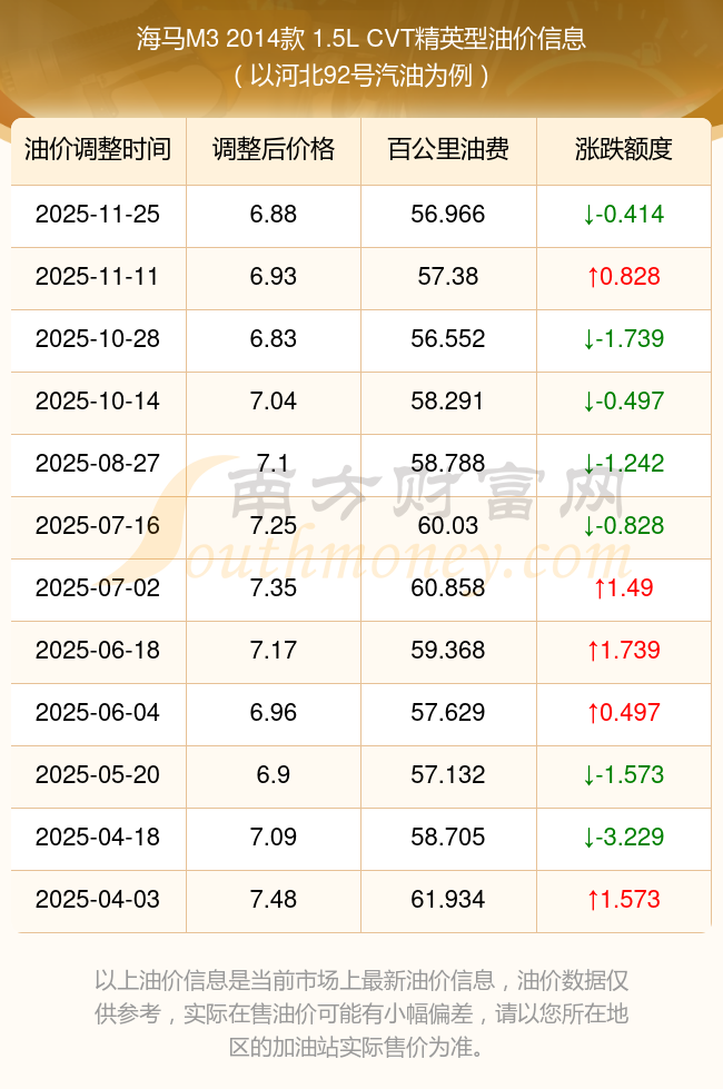 按11月25日92號(hào)汽油最新調(diào)整價(jià)格6.88元每升來計(jì)算(以河北為例),該車型百公里平均油費(fèi)為56.966元,按上一輪11月11日調(diào)整價(jià)格6.93元每升來計(jì)算,百公里平均油費(fèi)為57.38元,對(duì)比上一輪少花0.414元,下一輪油價(jià)調(diào)整時(shí)間為12月8日24時(shí)。