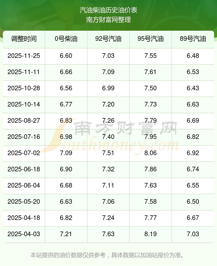 怒江汽油、柴油12月3日的價格是多少錢一升?具體如下:92號汽油為7.03元,下降了0.06元;95號汽油為7.55元,下降了0.06元;89號汽油為6.48元,下降了0.05元;0號柴油為6.6元,下降了0.06元,本輪油價的調整時間為11月25日。下一輪油價調整時間12月8日24時,距離現(xiàn)在還有5.53天。