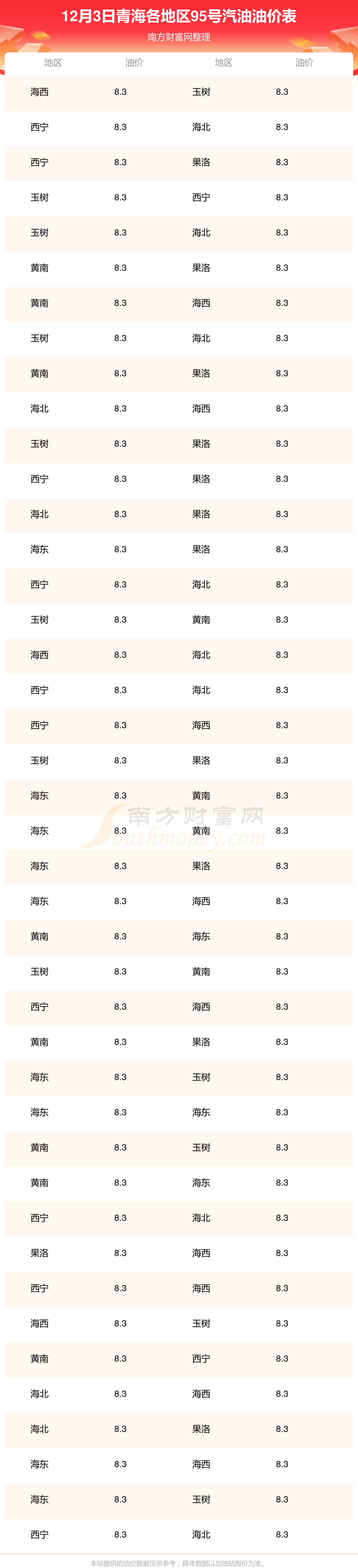 12月3日,青海95號汽油的價格是7.33元每升,本次的調(diào)整時間為11月25日,對比上次的調(diào)整下跌了0.06元,下跌0.812%,下次調(diào)整時間為12月8日24時,還有5.52天。