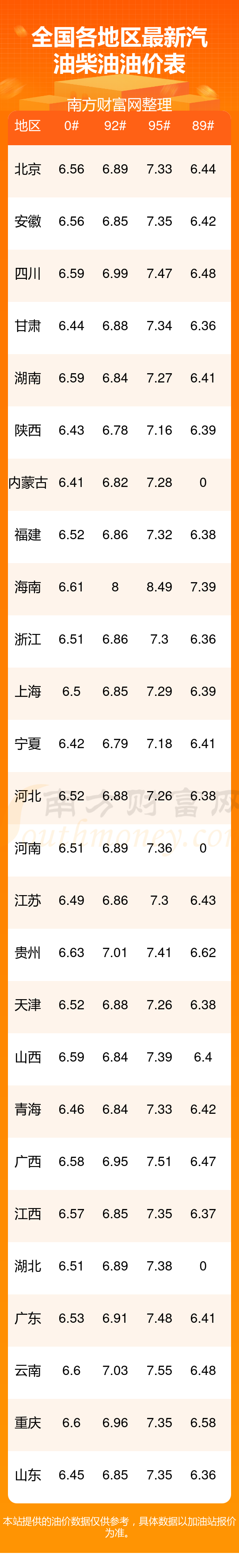 以上油價信息是當(dāng)前市場上最新油價信息,油價數(shù)據(jù)僅供參考,實際在售油價可能有小幅偏差,請以您所在地區(qū)的加油站實際售價為準(zhǔn)。