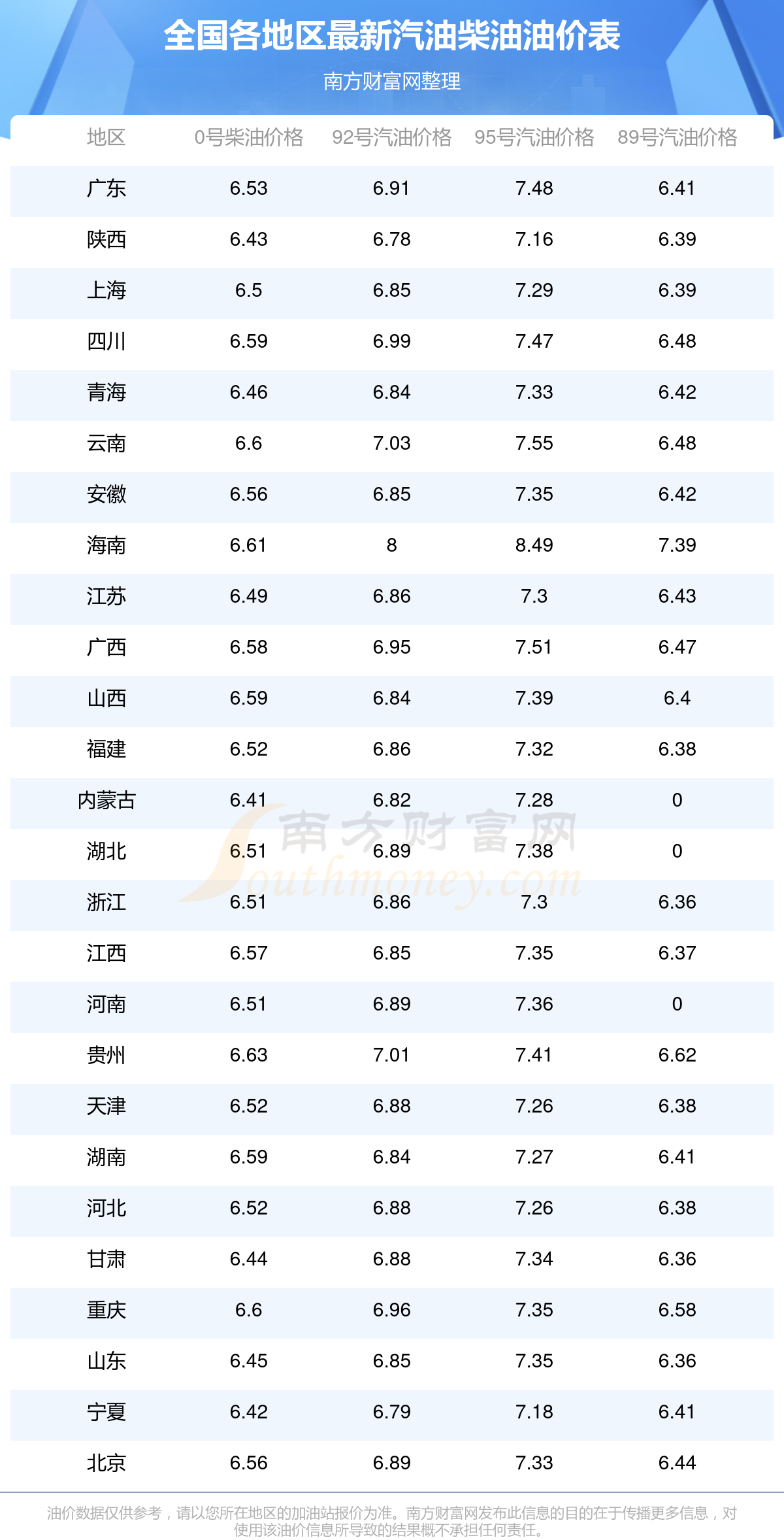 附:最新全國(guó)汽油、柴油價(jià)格一覽表