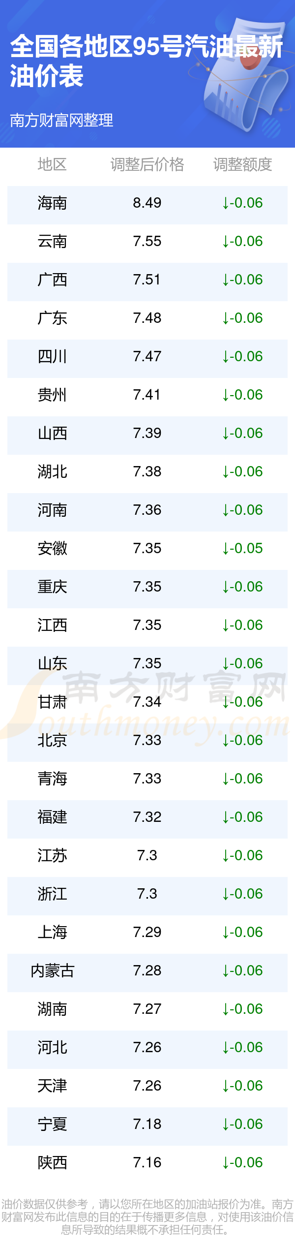 油價(jià)數(shù)據(jù)僅供參考,請(qǐng)以您所在地區(qū)的加油站報(bào)價(jià)為準(zhǔn)。南方財(cái)富網(wǎng)發(fā)布此信息的目的在于傳播更多信息,對(duì)使用該油價(jià)信息所導(dǎo)致的結(jié)果概不承擔(dān)任何責(zé)任。