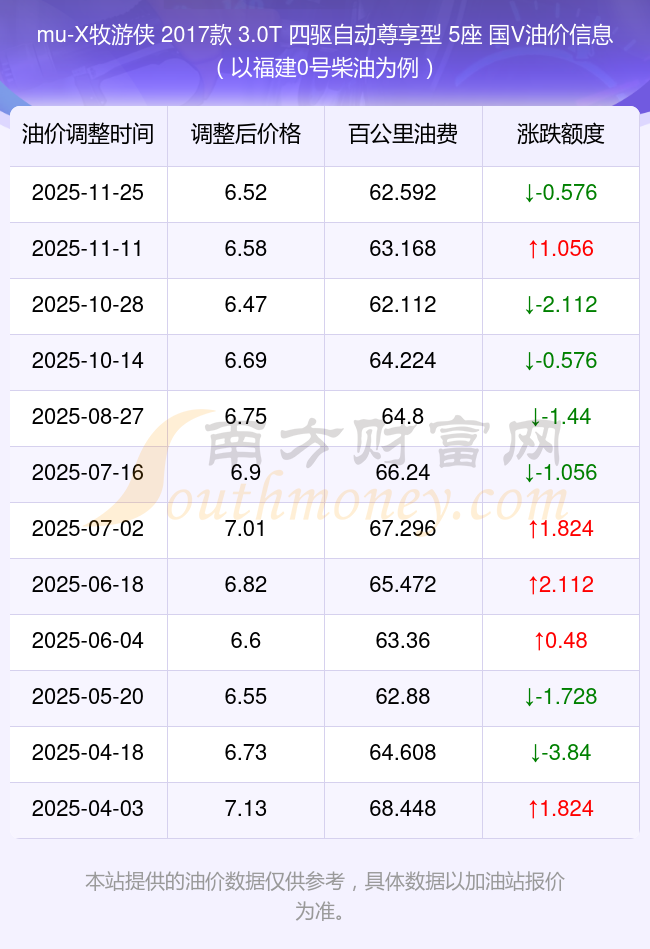 按照11月25日0號柴油最新調(diào)整價格6.52元/升來計算(以福建為例),該車型百公里平均油費(fèi)為62.592元,按照上一輪11月11日調(diào)整價格6.58元/升來計算,百公里平均油費(fèi)為63.168元,對比上一輪少花0.576元,下一輪油價調(diào)整時間為12月8日24時。