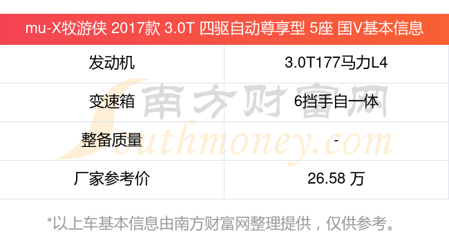 在動力上,mu-X牧游俠 2017款 3.0T 四驅(qū)自動尊享型 5座 國V配備的是一臺3.0T177馬力L4渦輪增壓發(fā)動機(jī),匹配的是6擋手自一體自動檔變速箱,燃料形式為柴油,廠家參考價26.58萬元。