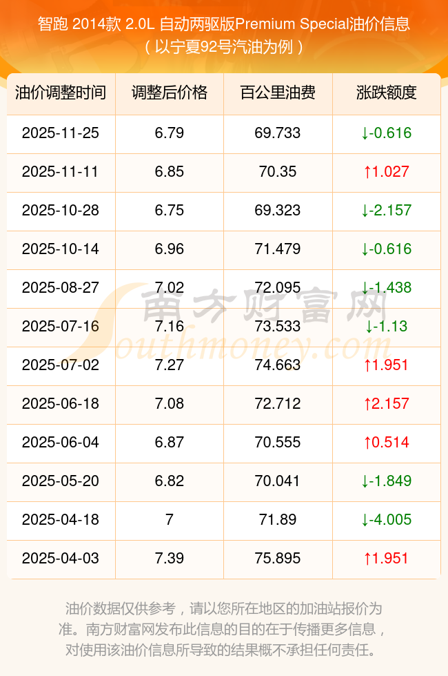 按照11月25日92號汽油最新調(diào)整價格6.79元/升來計算(以寧夏為例),該車型百公里平均油費為69.733元,按照上一輪11月11日調(diào)整價格6.85元/升來計算,百公里平均油費為70.35元,對比上一輪少花0.616元,下一輪油價調(diào)整時間為12月8日24時。