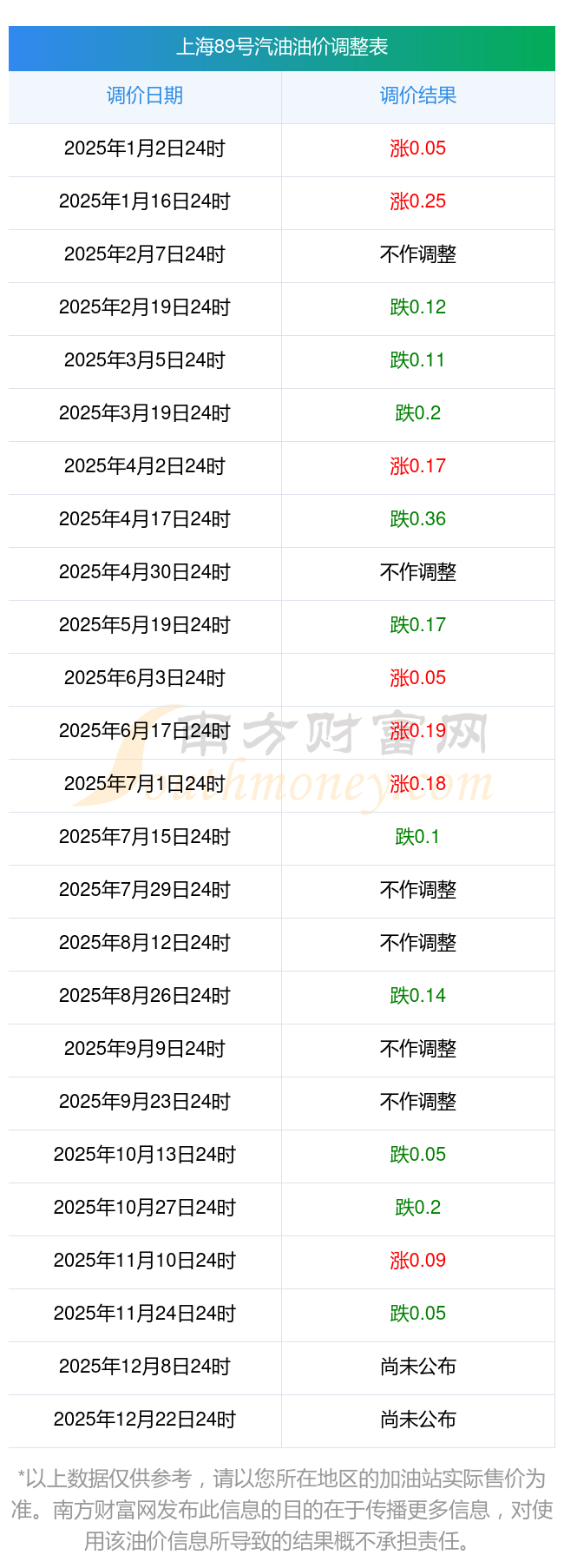 2025年上海油價(jià)調(diào)整日歷時(shí)間表