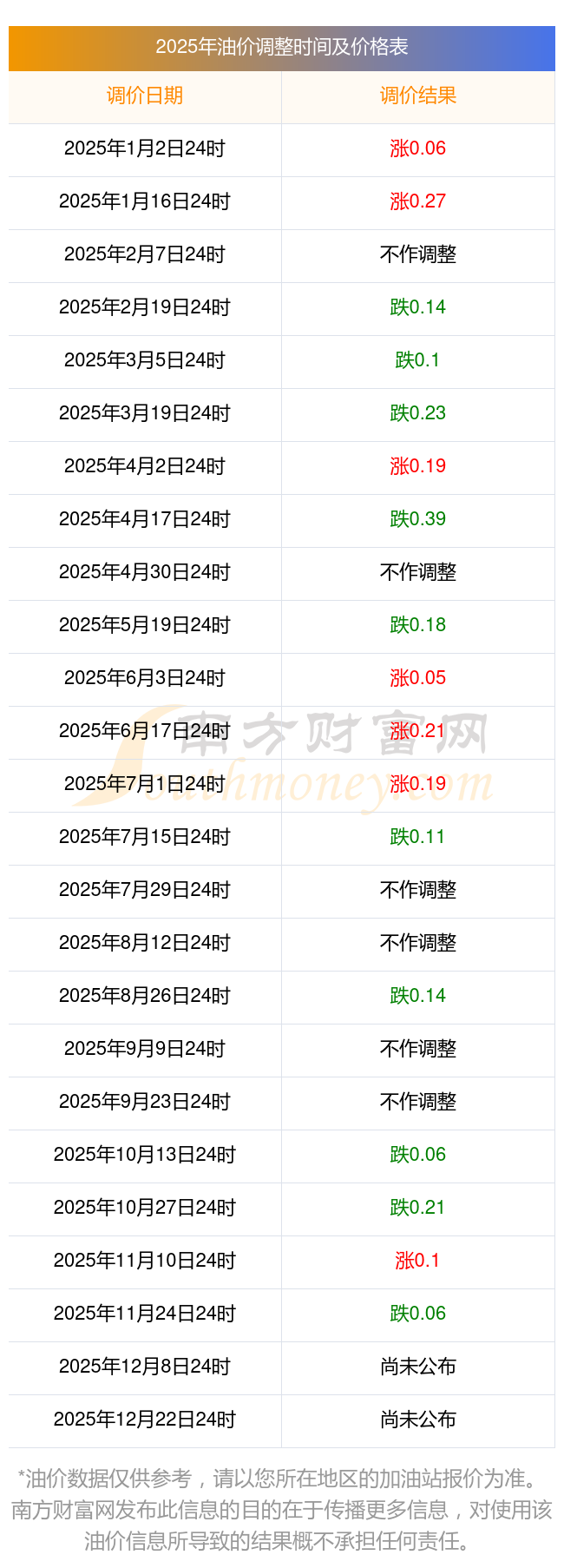 2025年12月3日油價調整時間及價格一覽表